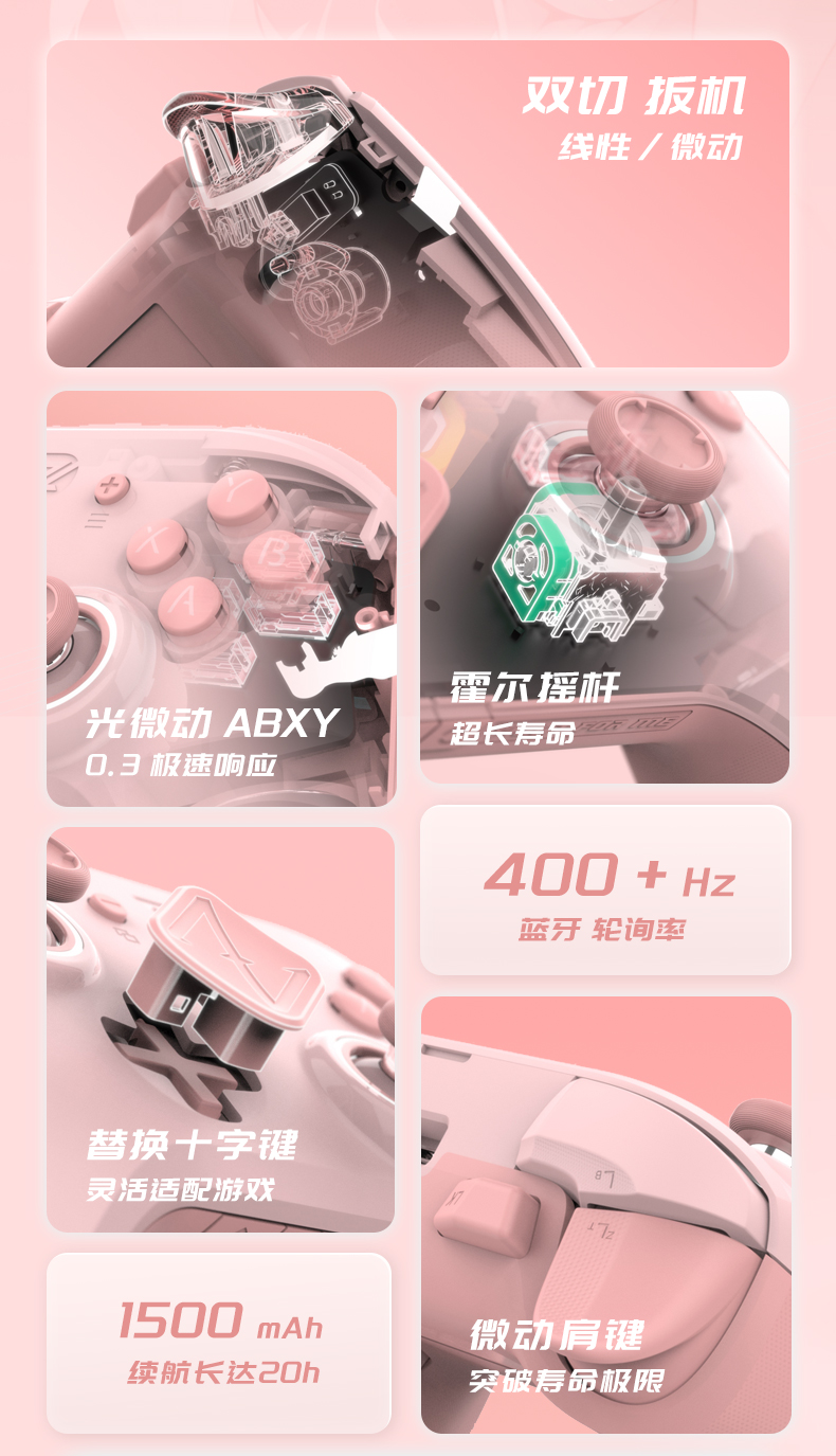 支持平台:任天堂Switch、电脑(Win7/8/10/11)、iOS 13/14/15、安卓6.0以上特色功能:自研app设置,支持手柄原生按键与键盘映射、连发、摇杆调节、模拟右摇杆体感功能、震动调节、十字键与左摇杆功能互换、ABXY按键替换、唤醒Switch、32步宏录制、ABXY按键灯与摇杆光圈调节、模式切换功能兼容协议:USB 2.0/3.0 蓝牙2.0/3.0/4.0/5.0接口类型:Type-C尺寸:156*107*68mm重量:250(±)g